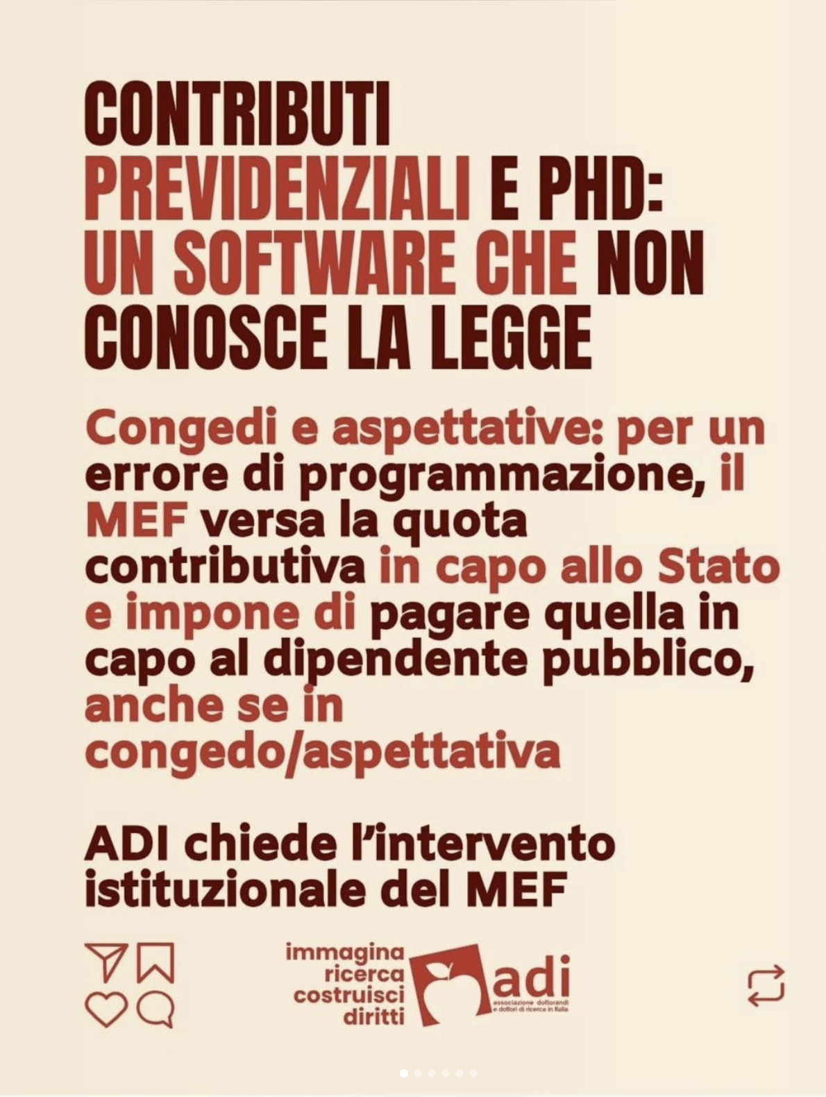 È da mesi che l’ADI si spende per arginare le inadempienze del MEF e l’arbitrio delle Ragionerie Territoriali dello Stato, che richiedono assurdi versamenti contributivi a PhD e Post-doc in congedo per dottorato con borsa o in aspettativa per assegno di ricerca.